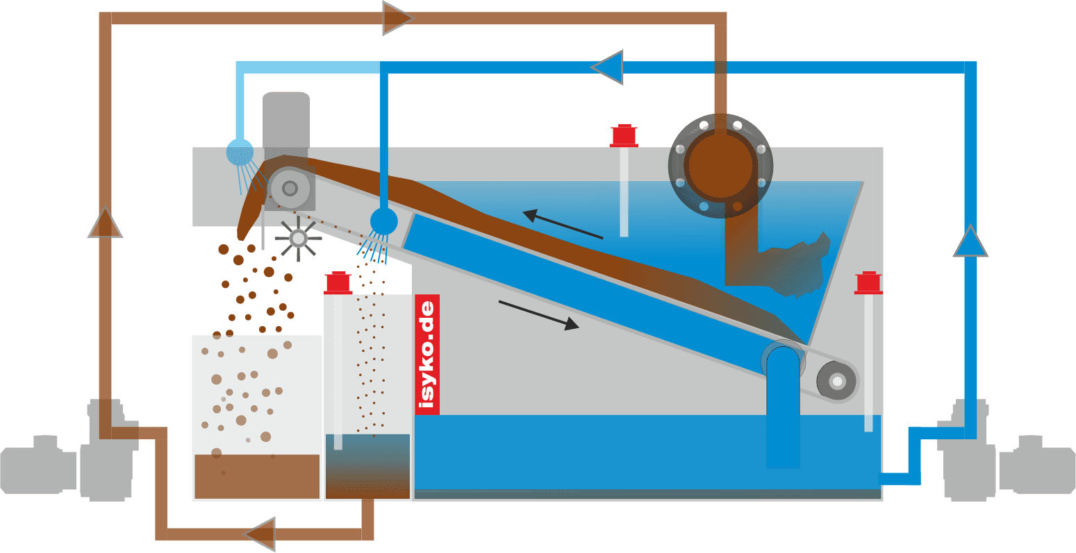In den meisten Fällen wird normalerweise gefilterte Prozessflüssigkeit zur Spülung des Endlosfilterband eingesetzt. Wenn diese ungefiltert und daher stark verschmutzt ist, oder wenn sich im Behälter zuviel feinstes Sediment befindet, wird sich das Filtergewebe von der "Unterseite" her zusetzen und auch die Düsen werden verstopfen. Die Spülpumpe saugt das Sediment und die Verschmutzungen an und "sprüht" diese auf die Innenseite des Endlosfilterband.