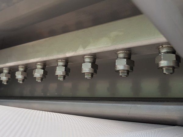 Das Filtergewebe wird mit Flüssigkeit durch Düsen unterhalb der Filterfläche durchspült.